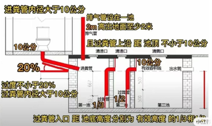 三格式化糞池的樣子。三格式化糞池簡單講就是按照2:1:3的容積比例,建成三個大小不一的池子。以一家四口為例,總容積不低于2個立方米,其中有效容積不低于1.5個立方米,第一格0.5立方米,第二格0.25立方米,第三格0.75立方米。池內按要求安裝過糞管。池上用蓋板密封,分別在每一格上留有清糞口,并在第一格上安裝排氣管。