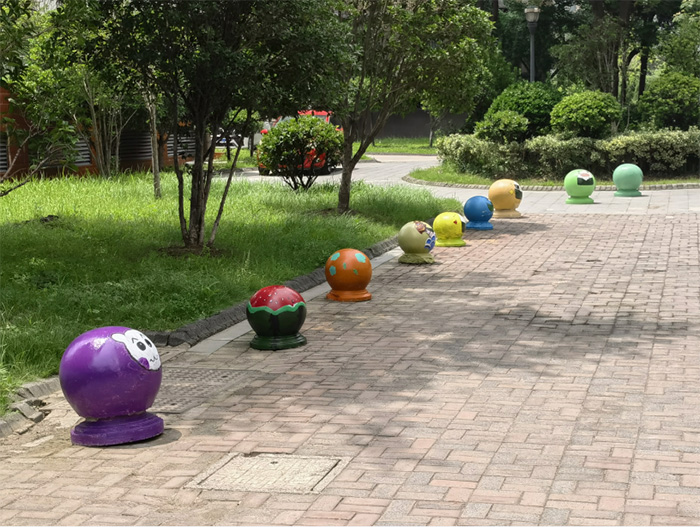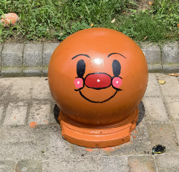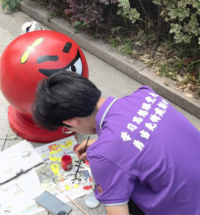 團隊成員陳鵬飛在社區進行石墩子的繪畫