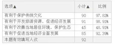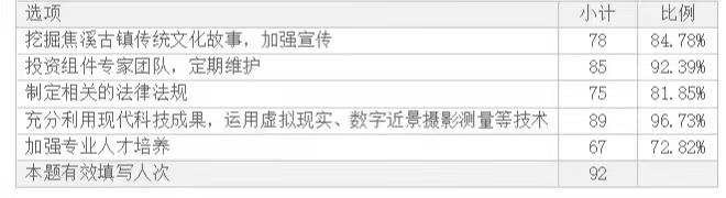 根據(jù)表格顯示,從調(diào)查結(jié)果來看,有90人認(rèn)為建設(shè)焦溪古鎮(zhèn)有利于保護(hù)傳統(tǒng)文化,占比97.82%,可以看出大部分人都較為認(rèn)同焦溪古鎮(zhèn)的文化價(jià)值。有91人認(rèn)為建設(shè)焦溪充分開發(fā)當(dāng)?shù)芈糜钨Y源,有利于推動(dòng)常州經(jīng)濟(jì)發(fā)展,認(rèn)同焦溪古鎮(zhèn)的經(jīng)濟(jì)價(jià)值,占比98.91%,我們要深入振興常州鄉(xiāng)村,需要充分挖掘焦溪優(yōu)秀鄉(xiāng)土文化資源,講好焦溪故事,留得住鄉(xiāng)愁,望得見遠(yuǎn)方,進(jìn)而形成文化產(chǎn)業(yè),賦能鄉(xiāng)村振興。有45人認(rèn)為修繕還原古建筑有利于改善當(dāng)?shù)鼐幼…h(huán)境,保護(hù)生態(tài),占比48.91%,習(xí)總書記強(qiáng)調(diào)社會(huì)主義新時(shí)代發(fā)展需要遵循“綠色”發(fā)展理念,“綠水青山就是金山銀山”,我們?cè)诎l(fā)展文旅的同時(shí),應(yīng)當(dāng)注重保護(hù)當(dāng)?shù)厣鷳B(tài)文明,堅(jiān)持以人民為中心。有85人認(rèn)為焦溪古鎮(zhèn)的開發(fā)遵循了“協(xié)調(diào)”發(fā)展理念,有利于促進(jìn)當(dāng)?shù)亟?jīng)濟(jì)全面發(fā)展,第一、第二、第三產(chǎn)業(yè)協(xié)調(diào)發(fā)展,占比92.39%。保護(hù)古建筑,重振焦溪風(fēng)采,對(duì)每位人民的生活都有著重要影響。