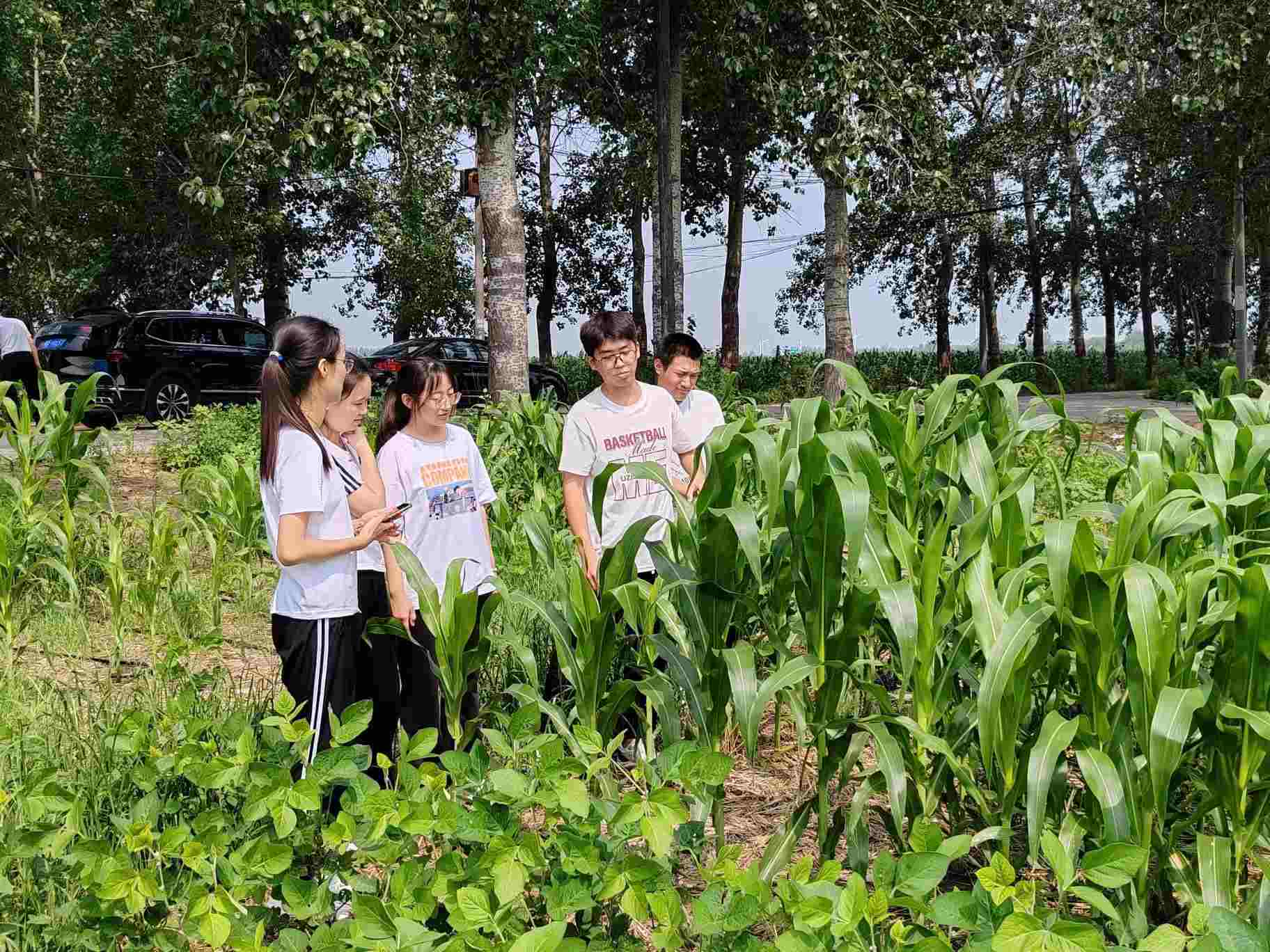 圖為實踐小分隊在種植田中調研作物長勢。