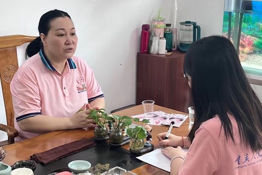 為了深入挖掘、宣傳畬藥非遺文化,助力畬藥錘板拍打治療法傳承,重慶人文科技學院“榕葉滿庭”非遺文化傳承與創新實踐團隊于參觀畬藥館結束后對畬藥錘板拍打療法代表性傳承人雷月蓮老師和尤昌佃老師采訪進一步了解其獨有特色、現狀并親身體驗畬藥錘板拍打療法的魅力。