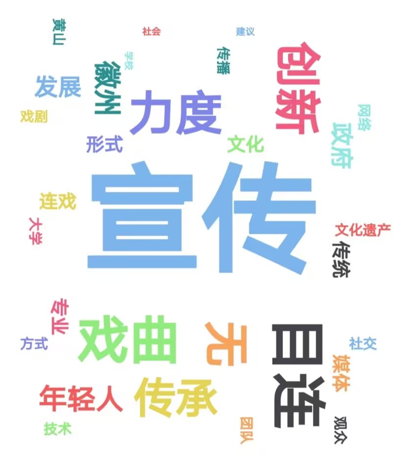 從上圖可以看出,宣傳一詞出現(xiàn)的頻率最高,傳承、創(chuàng)新、戲曲、力度等出現(xiàn)頻率次之。這些建議顯示了大多數(shù)人對目連戲的發(fā)展問題是很關(guān)注的,他們希望目連戲能更好的傳承下去。