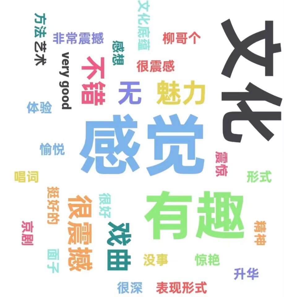 從上圖可以看出大部分人的感覺是把目連戲當(dāng)作一種文化符號(hào),震撼、有趣、魅力等詞高頻出現(xiàn),說明大家對目連戲總體上還是很喜歡的,演出觀看體驗(yàn)良好。