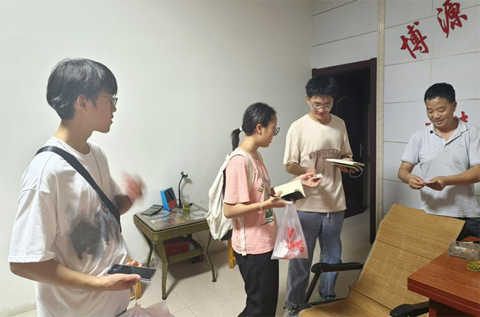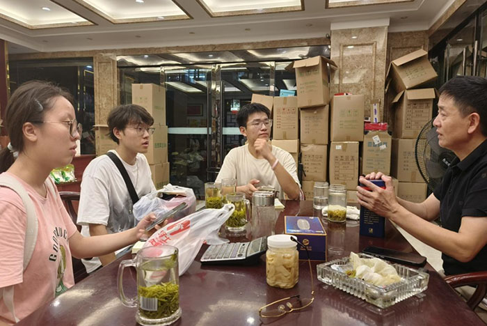 在采訪過程中,隊員們也被岳西茶葉的魅力深深折服。隊員們從多個角度如茶葉的種植模式、產量、茶園的日常管理、茶葉的銷售等出發,向受訪商戶進行提問。通過采訪對象一一詳細地回答,隊員們對岳西茶產業有了初步的認識和了解。隊員牛夢帆更是在采訪結束后對岳西茶葉贊嘆不已,并且購買了兩盒當地特產—岳西翠蘭留作紀念。