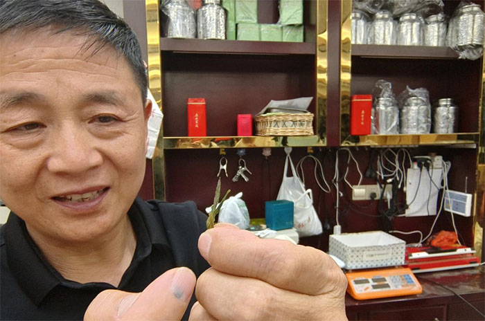 圖為茶葉店商戶向調研隊員介紹岳西翠蘭。