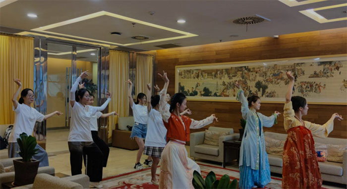 活動中,團隊在觀看完西安音樂學院舞蹈學院的同學們帶來的精彩絕倫的《霓裳羽衣舞》后,采訪了舞蹈隊員,因為舞蹈隊員在編排舞蹈時有參考壁畫的動作,詢問她們是怎么想到樂舞與壁畫結合起來的,她們回答說到:因為前段時間特別出圈的舞蹈詩劇《只此青綠》就是以《千里江山圖》為靈感創作的,所以舞蹈隊員在編排《霓裳羽衣舞》時,就在想她們是不是也可以從中國傳統壁畫上找靈感,于是實現了樂舞與壁畫的巧妙結合,樂舞里融匯壁畫,動中有靜,將靜態的壁畫以動態的形式表演出來,達到一個較好的表現效果。此次采訪,兩支實踐隊溝通討論了傳統壁畫對樂舞創作的積極作用,探討壁畫與樂舞巧妙的結合,引發了同學們對在新時代采用新技術新方式推進中國傳統壁畫創造性融合和創新性發展的思考。最后,西工大壁畫實踐隊向舞蹈隊員學習敦煌舞蹈動作,并簡單試跳一小段《霓裳羽衣舞》。