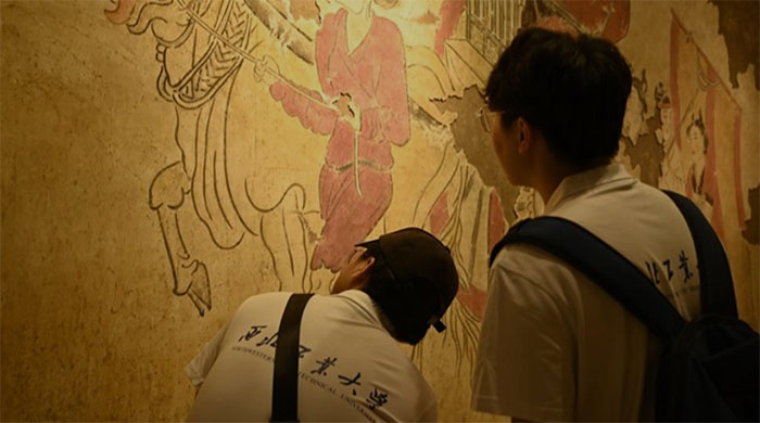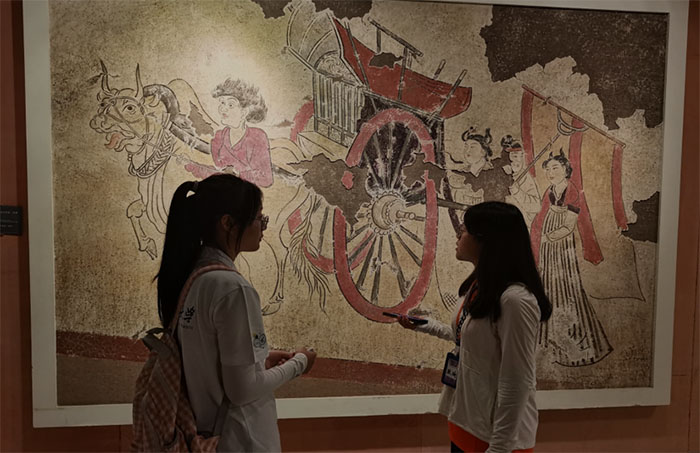 圖為實踐團隊成員在欣賞唐代壁畫作品。 通訊員 向運衡 供圖