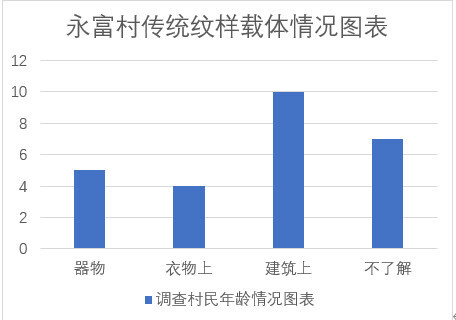 在對永福村的調研中,我們團隊主要采取的是問卷調研以及面對面討論的形式來對永富村傳統紋樣進行宣傳保護,同時也以整體團隊為基礎,點對點的進行對古建筑上的傳統紋樣進行收集。在對永福村當地村民的調研中,我們共計發放50份問卷,其中有效收回26份。而在本次調研的對象里,我們主要對中老年群體進行問卷發放(如下圖),而對于年輕群體,我們只是起到宣傳保護的作用,以此讓當年年輕群體能夠認識到有關傳統紋樣保護的重要性。