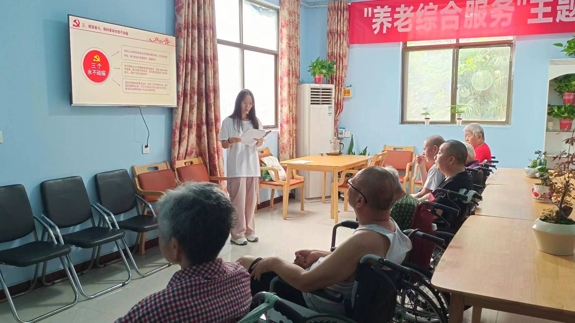 “金色麥田”暑期實踐團隊成員根據井岡山實地調研的成果,聯系老人們伴隨著中國走過的艱難歲月,將井岡山精神同中國發展緊密結合起來,從“堅定信念,堅持革命理想高于天”“艱苦奮斗,保持革命本色不動搖”“實事求是,敢闖新路,勇于創新”三個方面講述了井岡山精神的內涵及在時代的洪流中發揮的不可或缺的作用。革命精神在老人胸中激蕩回響,他們仔細聽著團隊成員的分享,目光堅定又悠長,似乎是回想起曾經積極投身于祖國建設之中的那腔熱血,雖從未踏上井岡山這片紅色故土,但星星之火早已在他們心中燃起,井岡山精神早已跨越時空影響著他們的一生。