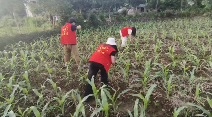 圖為團隊成員顧青青,趙正麗和丁學成一起下地幫助老人拔草。