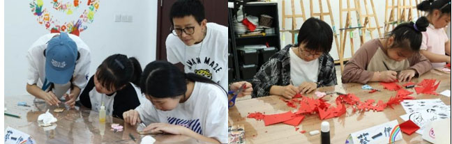 除卻大源鎮地方特色美育教學,團隊老師們還帶領同學們一起感受傳統非遺的精妙絕倫。在剪紙課上,同學們在老師的帶領下進行創作,他們將想象的翅膀裝在這小小的剪刀上,在一折一轉一剪中體驗“小小非遺傳承人”的樂趣。在琺瑯掐絲手工課上,同學們用銅絲固形、用顏料填色,用琺瑯掐絲這種傳統工藝傳遞對十二花神的喜愛與贊頌。在秦淮花燈手工課上,同學們制作花燈骨架、給花燈安裝花瓣,茫茫夜色中點亮的盞盞花燈照亮了孩子們的盈盈笑臉,也照亮了他們的萌動的尚美之心。