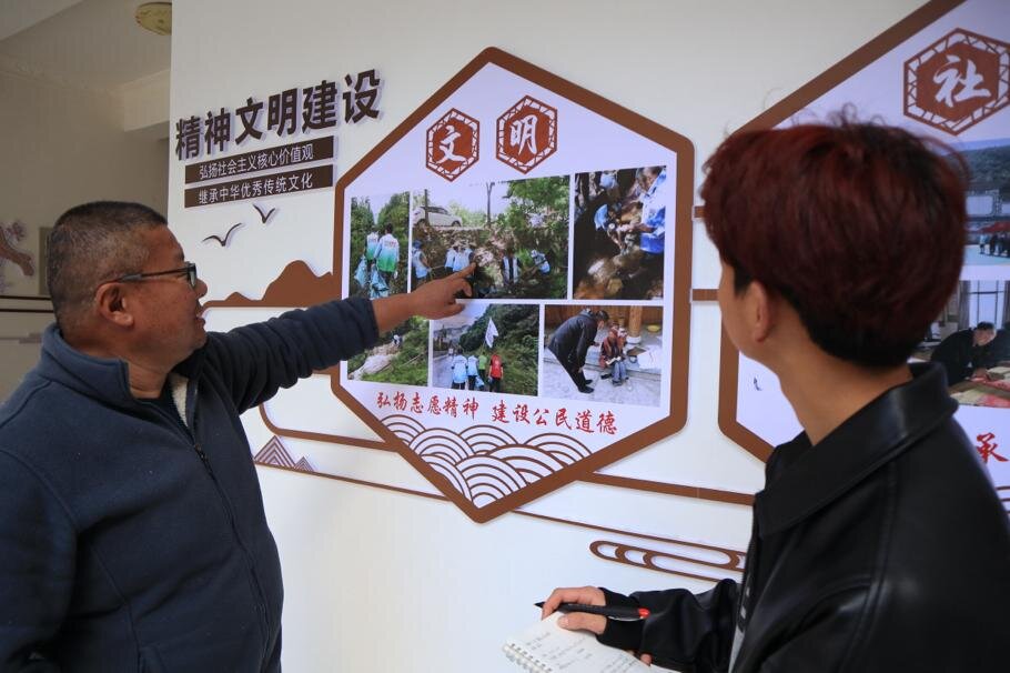 圖為實踐隊員與村內村民一同欣賞村內文化墻。文化墻設計融合了當地特色文化,展現了閆家溝村人積極向上的精神面貌。