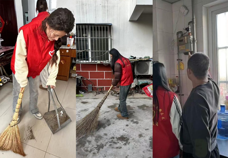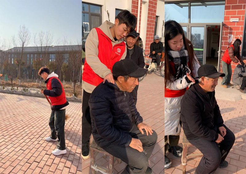 第四日下午“圓夢計劃”實踐團成員們首先開展了社區服務,其任務就是要先幫助社區打掃衛生,實踐團隊成員們齊心協力,共同清理路面。此次活動不僅改善了社區的環境衛生狀況,讓居民有了對環境的保護意識,營造了人人參與的一個良好的氛圍。同時,也為即將到來的新春佳節創造了一個整潔、舒適的生活環境,能夠讓老人保持一個良好的心情。其次,實踐團成員們紛紛為老人進行按摩,在按摩期間與老人聊天,更進一步的了解老人的生活,按摩不僅能夠有效的緩解疲憊,而且能夠有效的幫助老人刺激血液循環,減輕肌肉和關節疼痛。