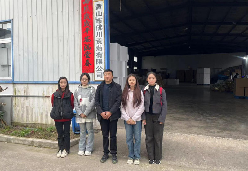 團隊結(jié)束參觀后,驅(qū)車來到另一家菊企——佛川貢菊有限公司,佛川貢菊成立于2012年,坐落于北岸鎮(zhèn)農(nóng)民工創(chuàng)業(yè)園,以黃山貢菊為主要產(chǎn)品。經(jīng)歷多年的發(fā)展佛川貢菊已經(jīng)形成了完善的產(chǎn)業(yè)鏈,團隊首先參觀了菊花生產(chǎn)車間,并對公司負責(zé)人胡海峰先生進行了訪談。