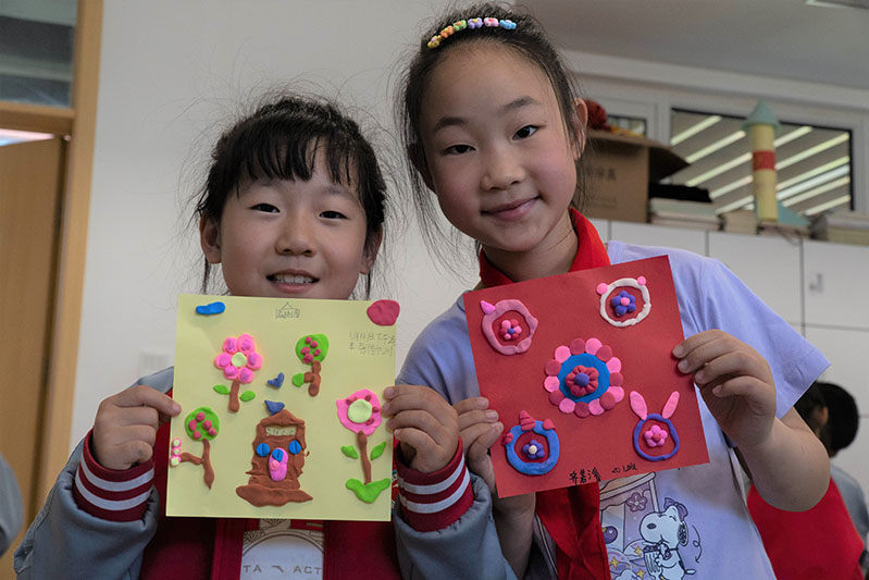 活動現場,機械2306團支部成員與星海灣小學201班的學生們一起作畫,用手中的畫筆描繪出身邊最溫暖的感動,用藝術的形式弘揚五四主旋律,傳遞青春正能量。安全2202團支部成員為108班的學生們分發“太空”泥和彩色卡紙,在團支部成員馬敬雯介紹完手工的制作步驟和注意事項后,108班的學生們用“太空”泥捏成一束束花朵,并寫上自己的祝福。108班學生劉煜說:“這束花是送給祖國媽媽的,我要對她說母親節快樂!“