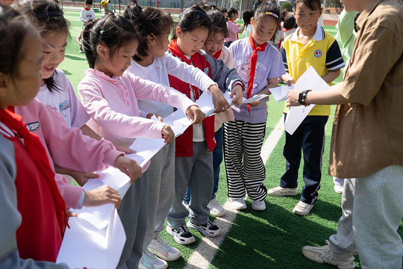 活動最后,在安全2202團支部成員李袁羽飛的帶領下,三個班級進行室外活動。A4紙傳遞乒乓球、老鷹捉小雞、一二三木頭人……田徑場上留下了學生與支部成員們的陣陣笑聲,青春活力在奔跑、跳躍間迸發。“我看著大家臉上洋溢著笑容,眼神中充滿了對生活的熱愛。這種積極向上的精神風貌,讓我感受到了青春的力量。“機械2306團支部成員王婧如是說。