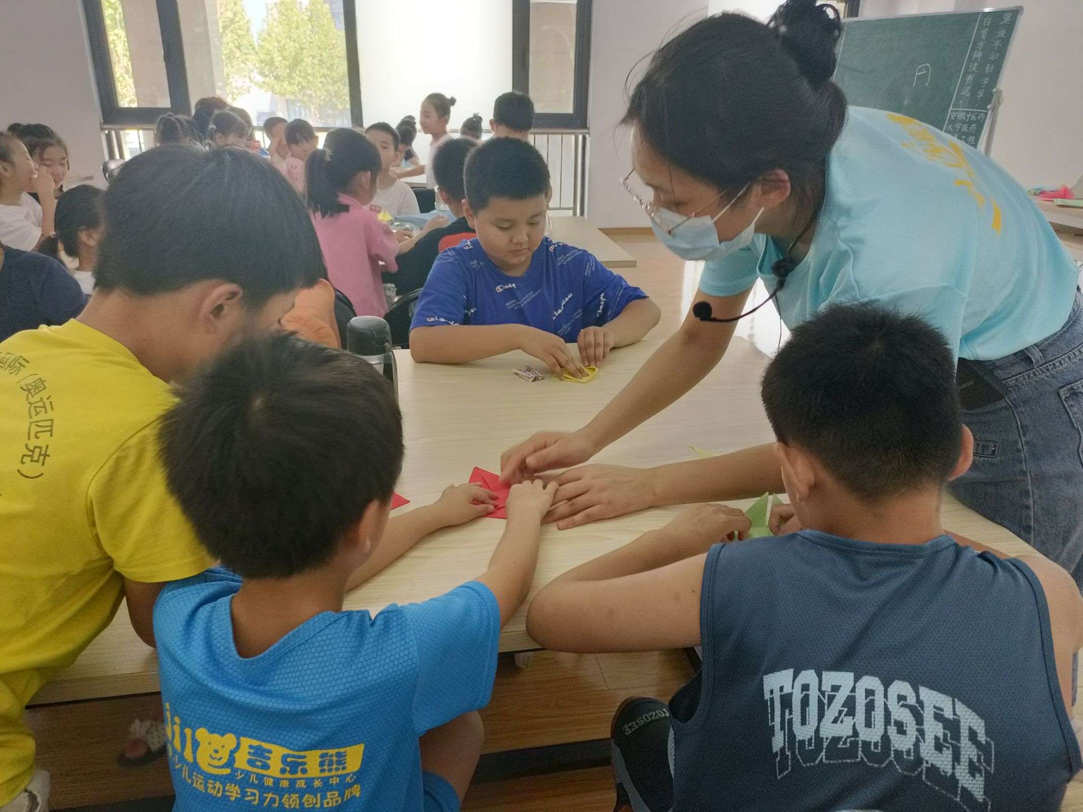 圖為實踐隊員在手工美術課上展示并教授“恐龍”的折紙方法,并為小朋友解決問題。
