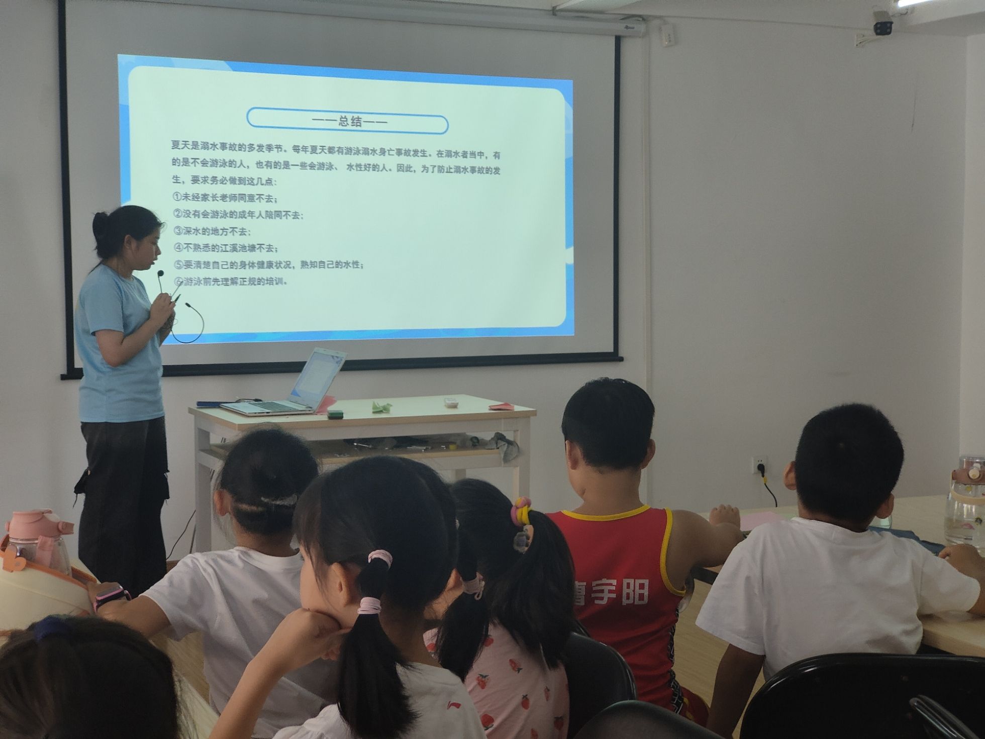 圖為實踐隊員在應(yīng)急救護(hù)課,為小朋友們進(jìn)行“防溺水”教育,并總結(jié)“防溺水”要點及注意事項。