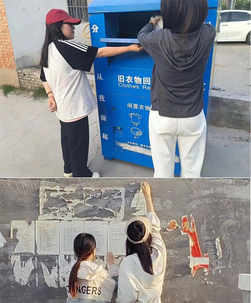 最后,這次活動我們也想了其他不同的實踐小活動,既然是與環保有關的,那當然不能簡單的只是進行宣傳和打掃衛生,再把我們的重點活動——打掃街道完成之后,其他小組的成員分別進行了撕小廣告、粘貼我們的環境保護宣傳小標識等。在進行活動的途中,我們發現了一個舊衣物回收處,我們認為這算是我們社會實踐活動的一個額外的小任務,也希望可以幫助到更多的朋友們。因為我們提前不知道有這個東西,每個人都沒有準備就的衣服,所以我們在進行環境宣傳的同時,也會希望更多的人知道有這個舊衣物回收處,我們也希望通過回收一些衣物來幫助到更多的朋友。