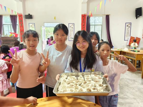 為保證食材的安全衛(wèi)生,老師們?cè)谡n前已經(jīng)準(zhǔn)備好新鮮的豆腐與,并提前安排學(xué)生消毒洗手。在授課的過(guò)程中,授課老師與助教老師共同指導(dǎo),協(xié)助學(xué)生食品制作。小手托起三角形不軟不硬的白豆腐,手中的勺子小心翼翼在表面上挖出小洞,再拿起筷子填入餡料。每一步,華祝村的孩子們都做得認(rèn)真而仔細(xì)。看著原本平平無(wú)奇的白豆腐呈現(xiàn)出釀豆腐的雛形,孩子們都為自己的努力感到開(kāi)心和驕傲。這就是親手勞動(dòng)的滋味,這就是客家釀豆腐的滋味,這就是家鄉(xiāng)梅州勤苦耐勞的滋味。小小釀豆腐,濃濃家鄉(xiāng)情。在這次的制作課堂中,學(xué)生們感悟到梅州客家文化的博大精深與動(dòng)手勞動(dòng)的樂(lè)趣,客家人血脈中的勤勞能干盡顯風(fēng)采。