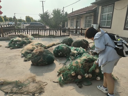 圖為實(shí)踐隊(duì)員觀察當(dāng)?shù)貪O民還未進(jìn)行修補(bǔ)正在簡(jiǎn)單晾曬的漁網(wǎng)。中國(guó)青年網(wǎng)通訊員 李浩宇 供圖