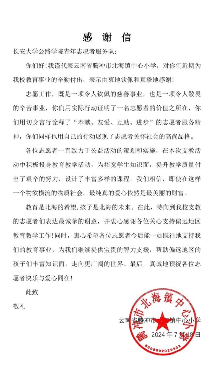 騰沖市委辦、教體局、團市委等相關負責人對我院的實踐活動給予了高度評價。他們表示這次支教不僅促進了青少年學生的成長成才,也為騰沖市的教育事業和鄉村振興注入了新的活力;同時對學子們的志愿服務精神表示贊賞,并希望其能夠繼續發揚精神,帶動更多青年投身到志愿服務事業中來。他們也表示將積極為長安大學與騰沖市之間的合作搭建平臺,共同推動志愿服務事業的發展。北海鎮中心小學也向實踐隊發來感謝信,感謝志愿者們對偏遠地區的教育教學工作的支持。