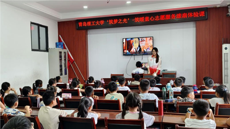 (圖為青島理工大學建筑與城鄉規劃學院"筑"暖童心志愿服務團在濟寧市陳莊暑托班漆扇課程授課現場)