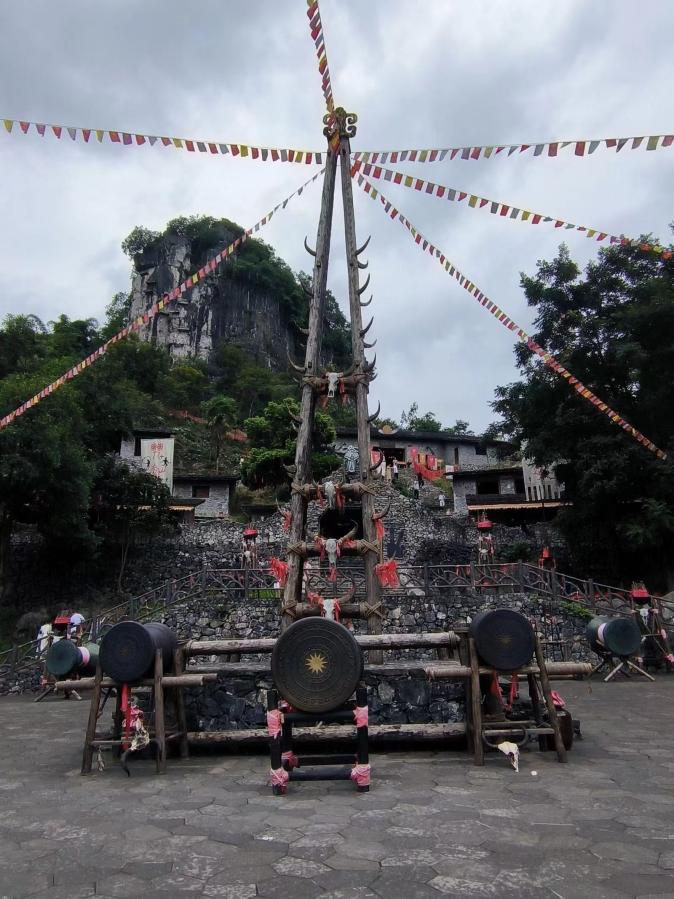 如圖為僰人祭祀時使用的牛角梯與青銅鼓