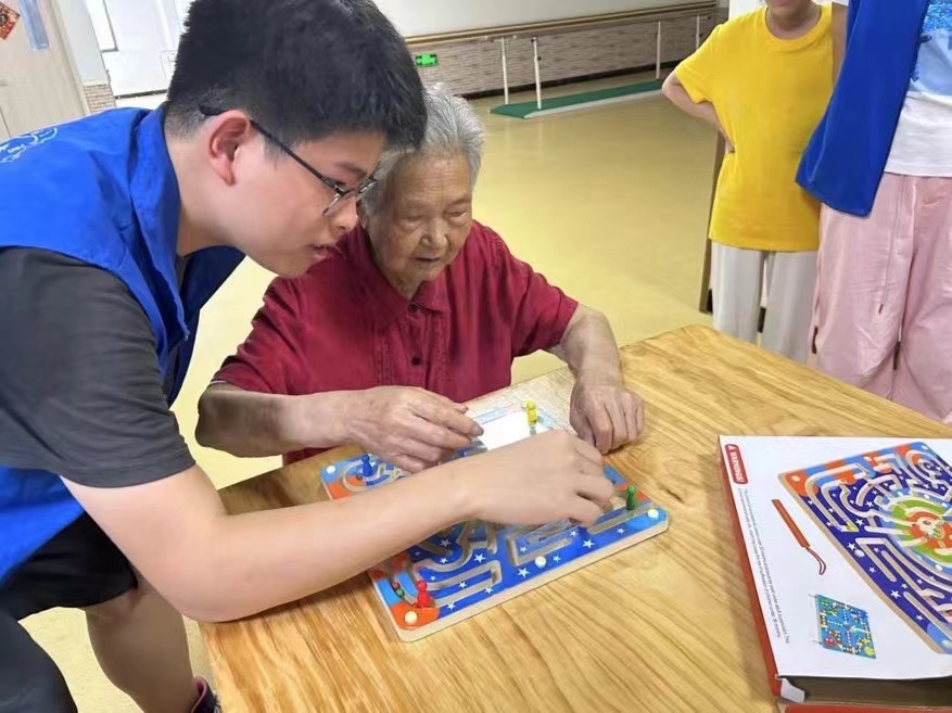 圖為志愿者陪老人玩游戲 宣紫怡攝