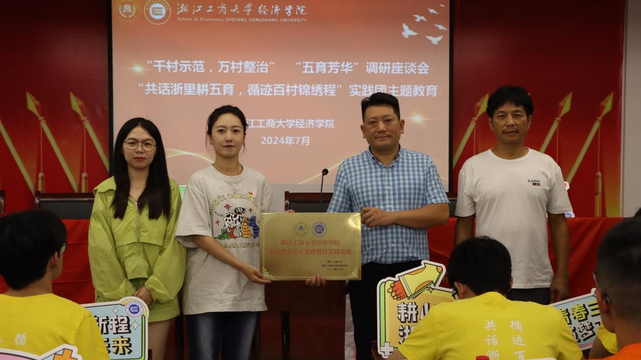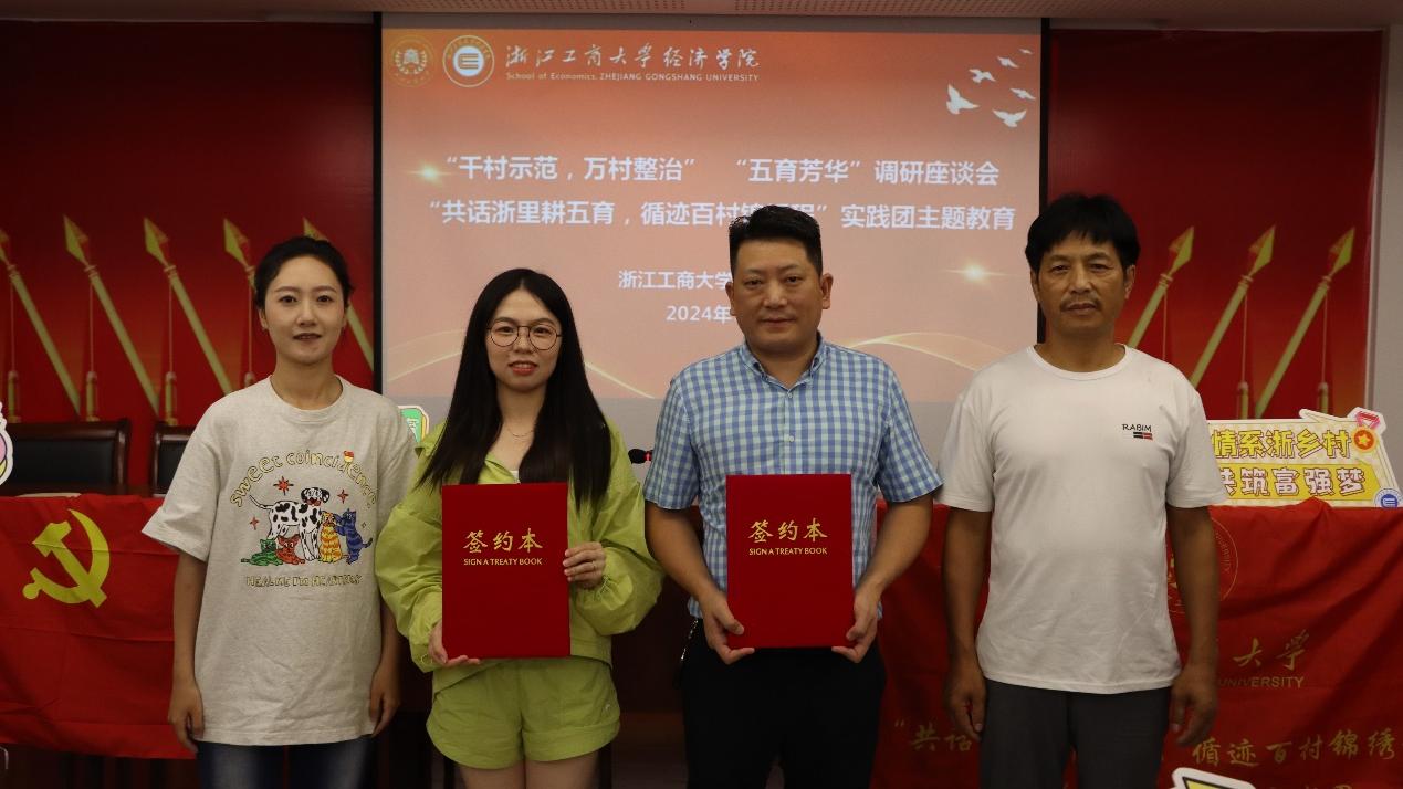 在訪談之后,浙江工商大學(xué)經(jīng)濟(jì)學(xué)院與上山村開展了簽約授牌儀式。莫瀟杭老師為上山村培育新時(shí)代大學(xué)生思政實(shí)踐教育基地授牌,村委書記方光鋒代表上山村接牌。隨后,莫瀟杭老師與方書記共同簽署了共建大學(xué)生社會實(shí)踐基地協(xié)議書,進(jìn)一步深化了雙方在社會實(shí)踐和人才培養(yǎng)方面的合作,為未來的長期合作奠定了堅(jiān)實(shí)基礎(chǔ)。