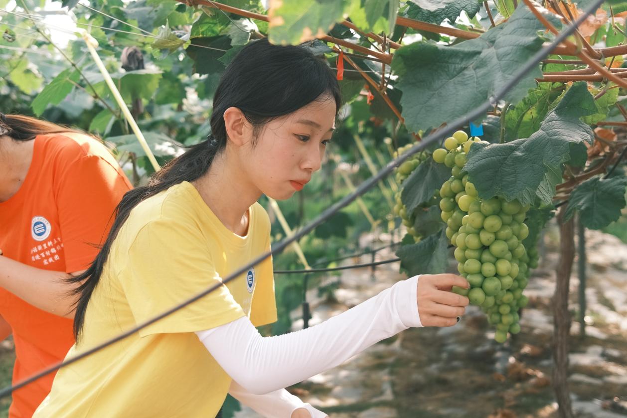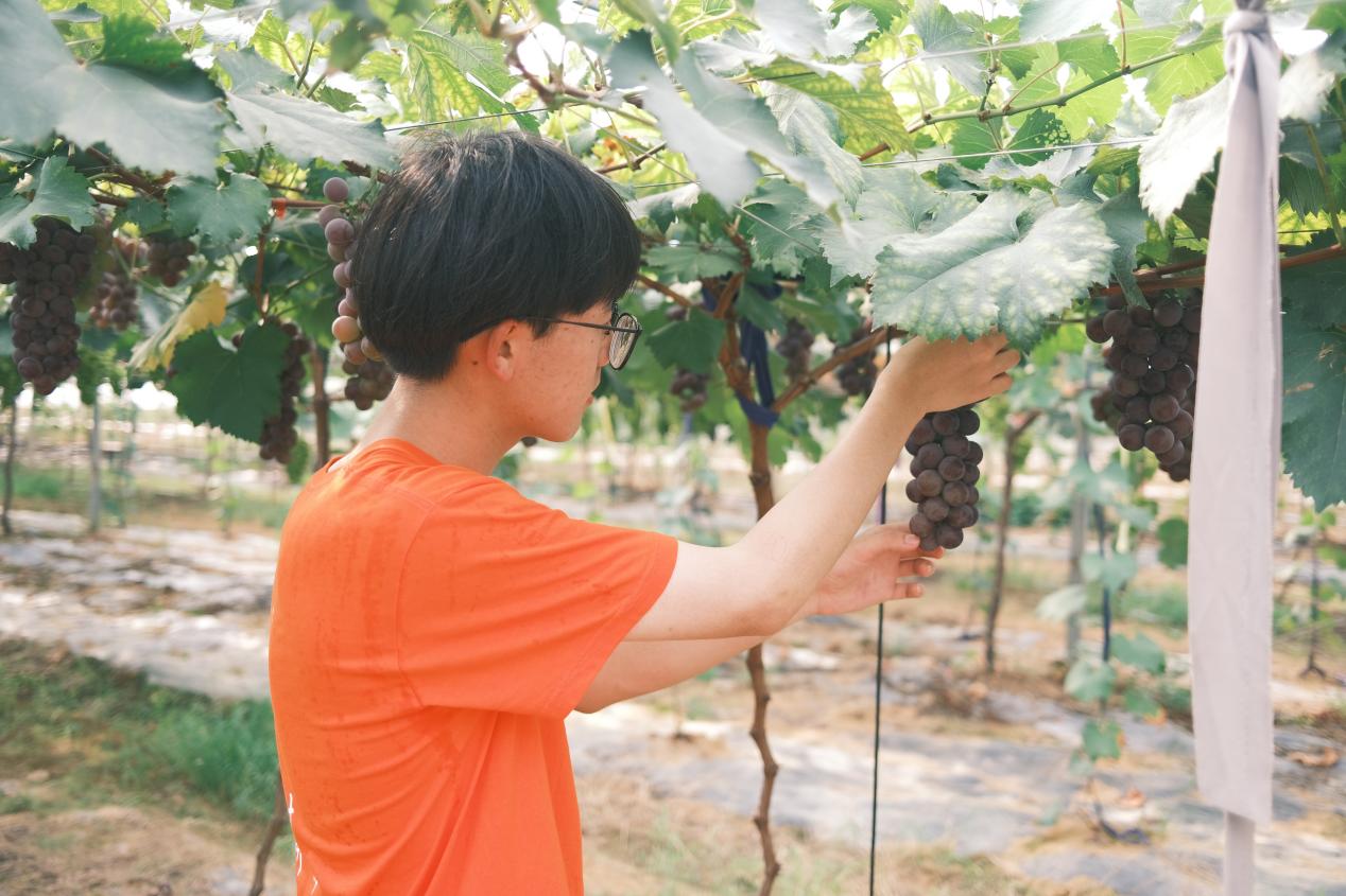 上山村葡萄種植園,一串串紅紫相間葡萄點綴在茂密綠色間,那沁人心脾的清甜香氣,引得實踐團的成員們食指大動,等不及直接采下一串放入口中細細地品味。在村民們的熱情招待下成員們都大飽口福。