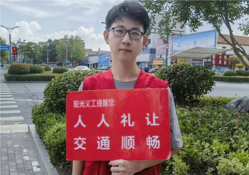 圖為 嚴(yán)書揚同學(xué)引導(dǎo)行人遵守交通規(guī)則