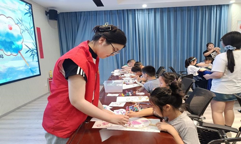 圖為書畫家教小朋友們如何進行團扇的繪制。楊恩熙 供圖