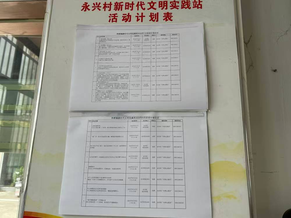 圖為永興村的活動計劃表。張云怡 攝 在參觀永興村社區(qū)的過程中,成員們了解到了和橋鎮(zhèn)永興村通過加強鄉(xiāng)村組織建設,增強鄉(xiāng)村社會的凝聚力和活力來助力鄉(xiāng)村全面振興。永興村積極開展各類社區(qū)活動,如“清潔家園,綠色未來”、“關注夏季老年疾病高發(fā)”“童心向黨,學習黨史”等活動。這些貼近生活而且形式多樣的活動既加強了鄉(xiāng)村社會的管理,又維護了鄉(xiāng)村的社會穩(wěn)定。