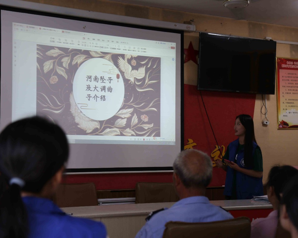 實(shí)踐隊(duì)前往寶豐縣鐵北社區(qū)開展宣講活動(dòng),借助所拍攝的資料以及制作PPT進(jìn)行宣講,讓當(dāng)?shù)鼐用窳私獾胶幽蠅嬜蝇F(xiàn)狀不容樂(lè)觀。之后實(shí)踐隊(duì)與社區(qū)干部進(jìn)行交流并實(shí)地調(diào)研,探尋強(qiáng)化非遺進(jìn)社區(qū)的途徑。同時(shí)為更好響應(yīng)國(guó)家《關(guān)于進(jìn)一步加強(qiáng)非物質(zhì)文化遺產(chǎn)保護(hù)工作的意見》,在探訪圓滿落幕后,實(shí)踐隊(duì)員們隨即投身于宣傳片的精心剪輯與曲藝技藝的刻苦練習(xí)中,為即將展開的“非遺進(jìn)校園”奠定堅(jiān)實(shí)基礎(chǔ)。