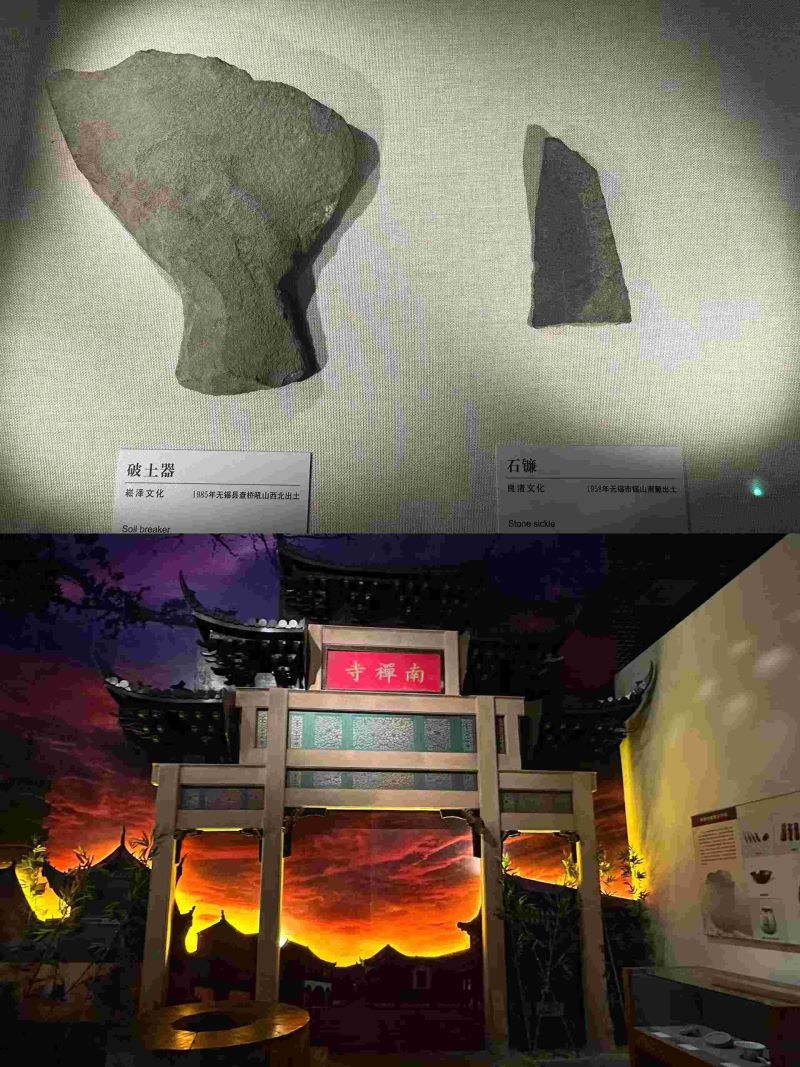 圖為史前時期石器和南禪寺正門復刻版。通訊員王雨婷 供圖