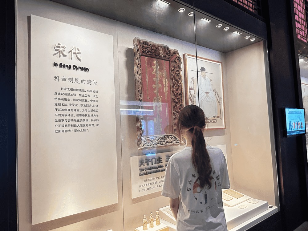 博物館內,五個展廳依次介紹了科舉制度的發展脈絡和歷史影響。從科舉制度的起源、發展到衰落,再到對后世的影響,每一個階段都有詳盡的展示和深入的剖析。實踐團成員們認真聆聽工作人員的講解,不時提出自己的疑問和見解。