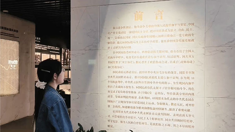 從周恩來的銅像到一樓展廳正中間雕刻著中央代表團領導成員和部分工作人員的大型漢白玉浮雕,再到生動展現了中國共產黨在南京的革命歷程和奮斗精神的文物和照片,團隊成員們懷著敬畏心境參觀完了這座以慶祝中國共產黨在南京建立的歷史為主題的紀念館。