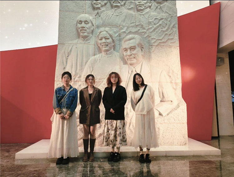 梅園新村紀念館主要由中共代表團辦事處舊址、國共南京談判史料陳列館、周恩來銅像、周恩來圖書館等建筑組成。實踐團隊進入一樓展廳后,首先映入眼簾的便是一尊漢白玉雕,玉雕上雕刻了幾位革命先烈,而他們身后的滾滾風云,也象征著革命的道路雖然風起云涌,但依舊會走向光明和勝利。玉雕四周陳列著國共兩黨重慶談判和南京談判的文獻史料、照片及部分實物,二樓展廳則是當年中共支持和發展愛國民主運動的照片和史料。