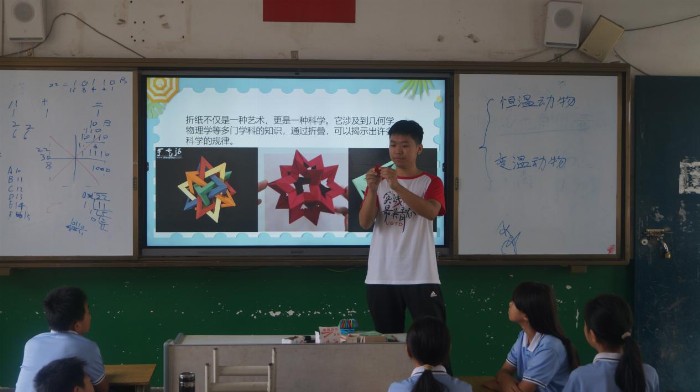 實踐隊成員們在社會實踐前期結合鄉村學生的實際情況和自身專業情況,積極準備課件、教案,并通過小組試講和相互交流等方式,不斷完善自己的課程,最終形成了豐富多彩的課程內容,包括物理、數學、化學等基礎學科知識,音樂、折紙等藝術類課程,素質拓展,地理和生物科普,寓教于樂,讓孩子們在快樂中學習。
