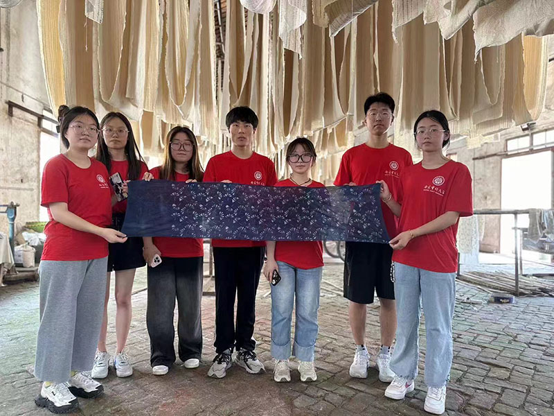 為了進(jìn)一步探索藍(lán)印花布印染技藝這一國家級(jí)非物質(zhì)文化遺產(chǎn)技藝,團(tuán)隊(duì)成員走進(jìn)藍(lán)印花布手工作坊,將理論知識(shí)付諸實(shí)踐。在工坊師傅的悉心指導(dǎo)下,團(tuán)隊(duì)成員親手參與了藍(lán)印花布的制作過程,從設(shè)計(jì)圖案、刻制花版到刮漿印染、晾曬成品,每一步都凝聚著他們的汗水與智慧。繁瑣的工序后,當(dāng)花布展開的那一刻,在欣賞點(diǎn)、線、面的融合交錯(cuò)中,團(tuán)隊(duì)成員體味藍(lán)印花布所特有的韻律美感,也對(duì)非遺技藝的傳承有了更深刻的認(rèn)識(shí)。