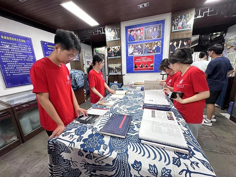南通藍(lán)印花布的印染技藝,至今已有500多年的歷史。團(tuán)隊(duì)成員首先來到中國藍(lán)印花布藝術(shù)傳承基地——南通藍(lán)印花布博物館進(jìn)行參觀學(xué)習(xí)。在博物館內(nèi),團(tuán)隊(duì)成員沉浸在歷史的長(zhǎng)河中,通過豐富的圖文資料、生動(dòng)的實(shí)物展示,深入學(xué)習(xí)了藍(lán)印花布的歷史發(fā)展、制作工藝、圖案寓意及文化價(jià)值。成品藍(lán)印花布,宛如一幅幅流動(dòng)的畫卷,藍(lán)白相間,清新脫俗。那細(xì)膩的紋理,仿佛能觸摸到時(shí)間的痕跡;那獨(dú)特的圖案,寓意深遠(yuǎn),承載著匠人的智慧與情感。這次文化理論學(xué)習(xí),不僅拓寬了團(tuán)隊(duì)成員的視野,更在他們心中種下了對(duì)傳統(tǒng)文化的敬畏與熱愛。