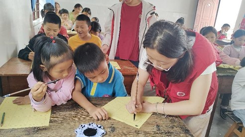 法書學貴得神靈,筆勢張顛最典型。書法專業的志愿者當起了學生們的小小書法老師,教學生們寫毛筆字。從握筆姿勢開始講解,蘸墨汁,舔筆,起勢下筆,行筆等等一一教導,給學生指正。教學成果顯著。