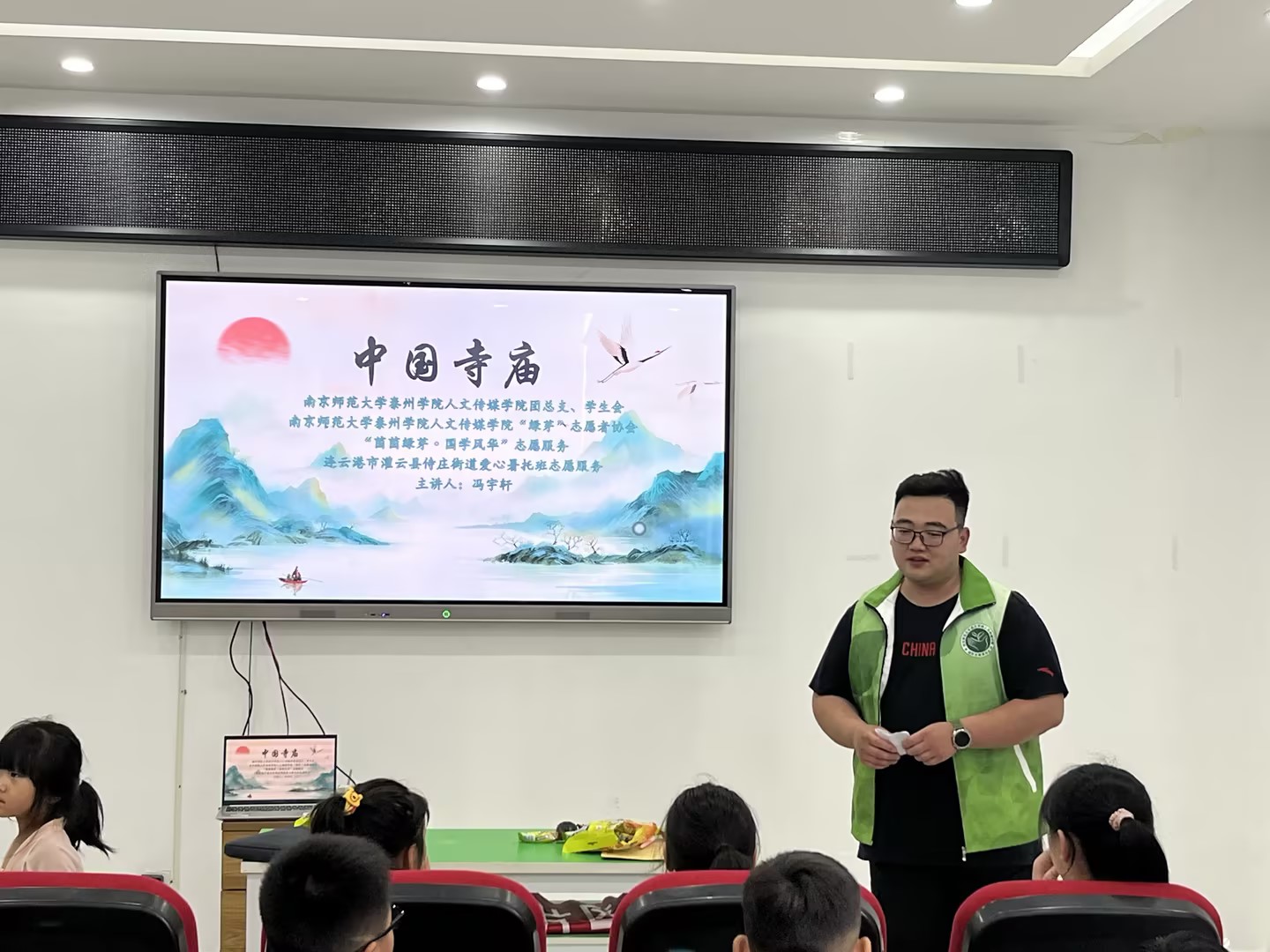 2024年7月22日,南京師范大學泰州學院人文傳媒學院“茵茵綠芽,國學風華”暑期社會實踐團隊的志愿者們走進連云港灌云縣愛心暑托班,圍繞著中國傳統(tǒng)建筑、二十四節(jié)氣、經(jīng)典名著閱讀等展開深刻獨到的宣揚和講解,為當?shù)氐男∨笥褌儙砹艘幌盗袊L氣息濃厚的課堂。