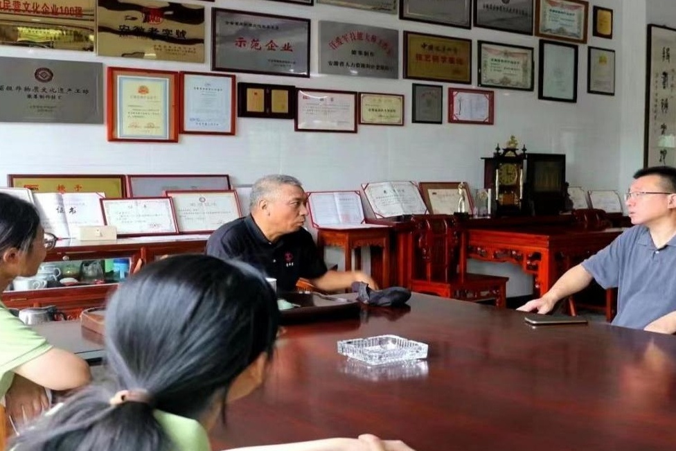 參觀結束后,團隊成員采訪了王師傅,了解徽墨如今的發展和創新。隊員們了解到,為確保徽墨更好地發展和創新,非遺傳承人汪愛軍先生相繼推出徽墨體驗、徽文化研學游等特色旅游產品,并搭載“一帶一路”實現對外交流。此外,在得知制成一塊徽墨須經兩年之久時,團隊成員詢問是否可以通過機械化提高效率,王師傅堅定地回答道:“徽墨的制作過程絕不能馬虎,每一塊徽墨的狀態都需要我們親眼看、親手感。”這使團隊成員深感徽墨文化的厚重以及傳承人的匠心堅守。