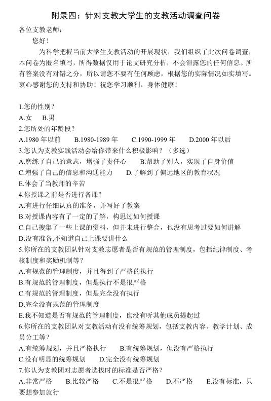 3.支教內容設置不合理大學生支教前策劃,雖然會根據預先規劃的課程展開,但是課程都是由支教大學生設置的,他們會上網搜集比較有吸引力的潮流內容。這樣的內容能一定程度上激發學生學習的興趣,但也使得課堂秩序混亂,學生上課隨意發揮想象、注意力不集中等不好的習慣。