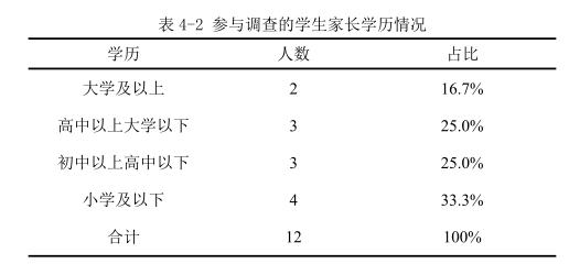 大學生支教活動不僅給當地學校、教師以及學生帶來積極影響,也會給學生家長帶來一定的積極影響。而且這類家長文化水平不高,如下表所示是本次調研中 12名家長的學歷情況。