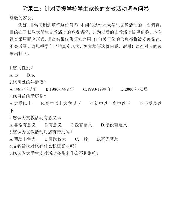 本研究發放了四種問卷,問卷調查對象分別是李靜老師、家長及學生大學生。設置不同的問卷更加保證了本次調研結果的準確性。對于李靜老師,我們著重了解李靜老師觀察下,我們的各方面的成效以及學生的狀態。對于學生家長,站在社會層面去聆聽他們對于鄉村教育,大學生支教的獨特見解。對于學生當事人,我們更加需要了解他們最真實的想法與獨特的見解。對于大學生,文化水平高,我們應該從你們身上去探尋動機目的,經驗體驗等獨特的想法。