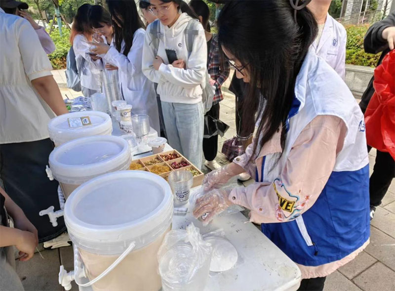 中藥奶茶將傳統(tǒng)的中草藥與經(jīng)典的奶茶相結(jié)合,借助傳統(tǒng)中藥的獨(dú)特功效,為品嘗者提供健康、美味和滋養(yǎng)的飲品體驗(yàn);顒(dòng)現(xiàn)場(chǎng),一排精心布置的奶茶攤位上散發(fā)著中藥香氣與奶茶的甜美味道,令人垂涎欲滴,吸引大批師生駐足品嘗和駐足欣賞,共同感受著中藥奶茶帶來的獨(dú)特魅力。這款特別調(diào)制的奶茶,融合了中醫(yī)藥材和牛奶,不僅口感醇厚,更兼具養(yǎng)生功效;顒(dòng)主要分為兩個(gè)區(qū)域,DIY區(qū)域和品嘗區(qū)域。在上午十點(diǎn)半活動(dòng)準(zhǔn)時(shí)開始,DIY區(qū)域?qū)W生發(fā)揮自己的想法在奶茶杯子上貼上自己喜歡的貼畫;品嘗區(qū)域志愿者準(zhǔn)備五種奶茶,有桑葚玫瑰奶茶、五指毛桃奶茶等等。學(xué)生拿著自己DIY的杯子選擇志愿者所準(zhǔn)備的五種中藥奶茶中進(jìn)行選擇,同時(shí)志愿者還準(zhǔn)備了干花,如玫瑰花、茉莉花、槐花、桂花等等裝飾在奶茶上方,并幫助進(jìn)行打包。攤位前,志愿者耐心為同學(xué)們?cè)敿?xì)介紹中藥奶茶的選材、制作流程和中藥材的藥效作用,讓同學(xué)們?cè)谳p松愉快的氛圍中了解到更多關(guān)于中醫(yī)藥的知識(shí)。