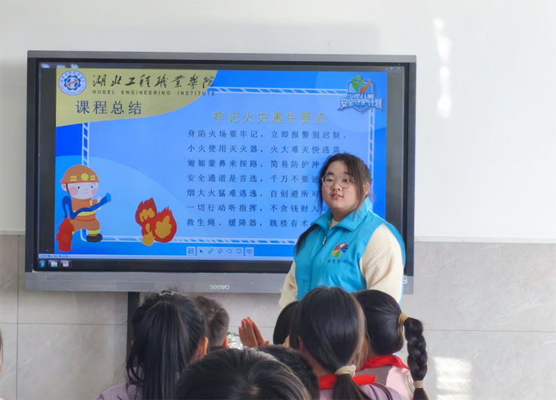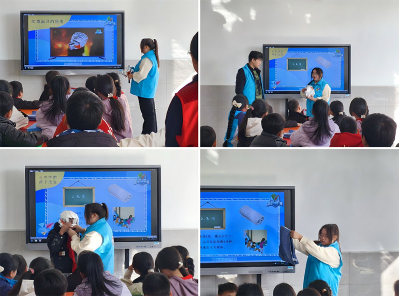 爭做消防小衛士 2024年11月28日星期四,湖北工程職業學院管道保護宣傳志愿服務小隊于下午兩點在黃金山實驗小學開展教學志愿活動。董萬萌擔任《爭當消防小衛士》課程老師,本次課程旨在通過系統的教學與豐富的活動,加深學生們對“火”的進一步認識,并且通過現場演示與教學,使學生們掌握在火災環境中利用濕毛巾和防火面具進行自我保護的方法。此外,課程還設置了小學生上臺演示正確逃生技巧的環節,每位同學均積極參與,課堂氛圍熱烈。課程尾聲志愿者老師組織同學們對本節課的內容進行了回顧,并再次強調了正確逃生的步驟。